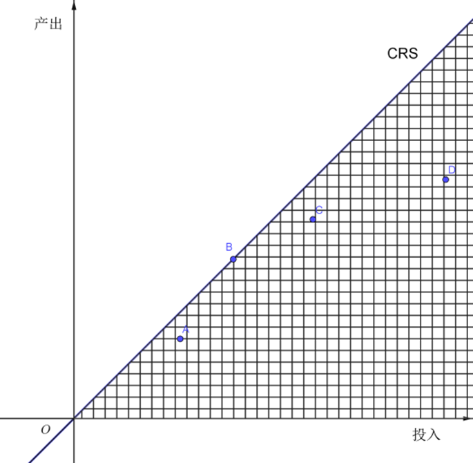 注:单投入单导出的生产可能集(DEA 技术集),就是如前文图示的前沿线(面)及其右下方的区域,可以是规模收益 CRS 或 VRS 假设下。