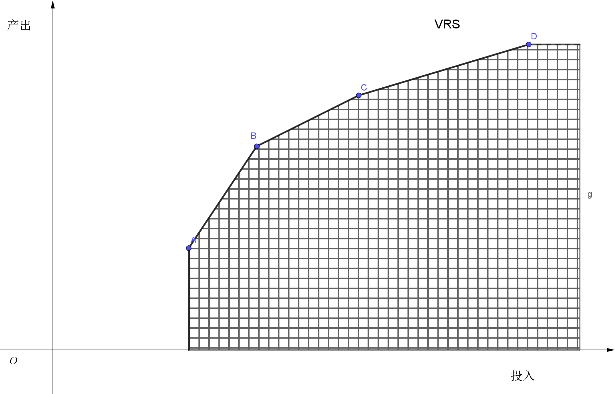 如果无法确定研究样本处于哪个阶段,则评价技术效率时应选择规模收益可变(VRS)模型,即模型中的 \(\mathbf{\lambda}\) 满足 \(\sum \mathbf{\lambda} = 1\),此时生产可能集(DEA 技术集)为以线段 ABCD 以及 AD 往坐标轴的垂线为前沿(凸组合):