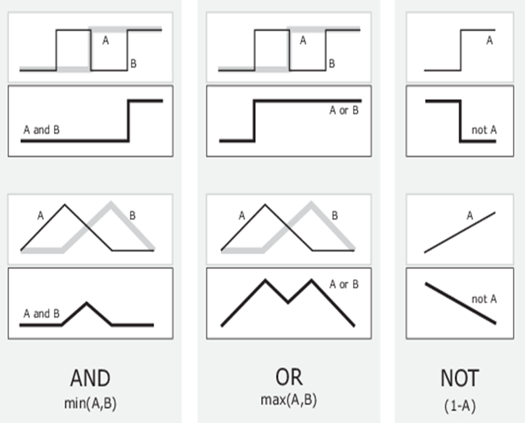 例如,上面右图就是周几隶属于周末的程度的隶属函数曲线,根据该函数可以计算无论周几的任一时刻属于周末的程度是多少。