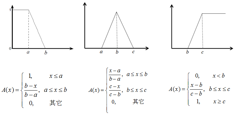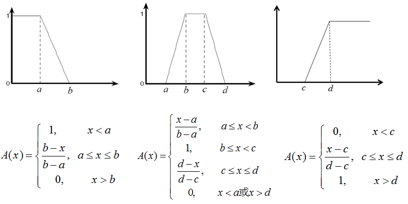 用隶属度函数 \(\mu_A(\cdot): A \to [0,1]\) 表示,它确定了 \(X\) 上的一个模糊集 \(A\)。\(\mu_A(x)\) 越接近 \(1\),表明 \(x\) 属于 \(A\) 的程度越大。